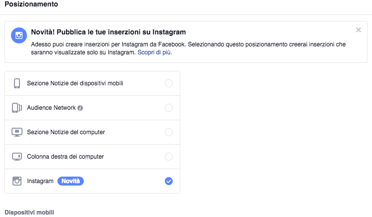 I passi successivi sono molto semplici. Basterà avviare una campagna, come avete sempre fatto per l’account Facebook, inserendo budget, programmazione, interessi, costo e posizionamento dell’annuncio su Facebook e/o su Instagram tramite le spunte: Sezione Notizie dei dispositivi mobili, Audience Network, Sezione Notizie del computer, Colonna destra dei computer e Instagram.