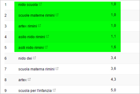 Nello screenshot seguente, invece, vengono riproposte le parole chiave che permettono al cliente di posizionarsi in prima pagina. I numeri sulla destra corrispondo alla posizione media in cui si trova il sito nella SERP: ad esempio, digitando “scuole materne rimini” o “asilo nido rimini”, il sito Il Nido dei Cuccioli si troverà molto probabilmente al primo posto (1,0 significa “mediamente prima posizione”); digitando invece “scuola per l’infanzia” sarà probabile trovarlo circa al quinto, e così via.
