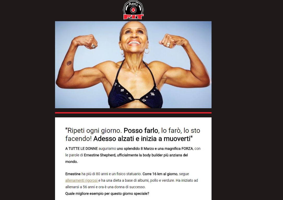 Racconta una storia: lo diciamo spesso, ma il poco tempo a disposizione e la scarsa voglia di essere creativi ci blocca. La narrazione aiuterà il tuo target a identificarsi nella comunicazione: per questo, abbiamo scelto una frase di Ernestine Shepherd, la body builder più anziana del mondo, per augurare un buon 8 marzo a tutte le donne interessate ai contenuti proposti da Abc Allenamento.