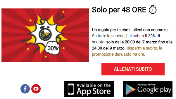 Nella seconda parte della tua comunicazione, una volta stabilita empatia con il target di riferimento, potrai proporre un’offerta ad hoc. Vi consigliamo di indurre nelle persone una sensazione di urgenza o di scarsità, così da renderle più sensibili a una possibile perdita che a un potenziale risparmio: nel nostro caso, uno sconto del 30% sui prodotti Abc Allenamento, valido però solo 48 ore!